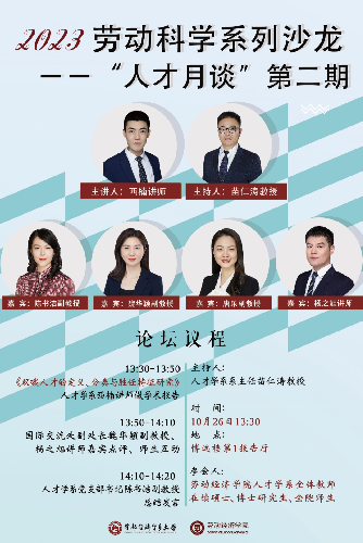 10月26日下午,17直播 人力资源开发与人才发展系(以下简称人才学系)、北京经济社会发展政策研究基地共同举办的劳动科学系列沙龙——“人才月谈”第二期在博远楼第1报告厅成功举办。人才学系教师、在读硕博研究生参会。