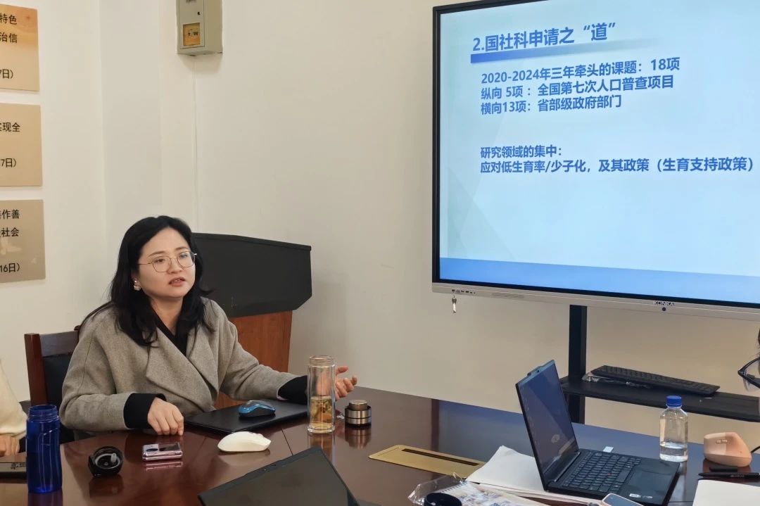 童玉芬结合自己的项目申报经验,以“国社基金申报中填写需要避免的几个‘坑’”为题,为教师们分析了国家社科基金项目申报中常见的误区,并从选题、文献综述、结构安排及写作技巧四个方面,提出了具体而精准的申报建议。她的分享为教师们提供了可操作性的指导,帮助大家避开常见的申报陷阱。