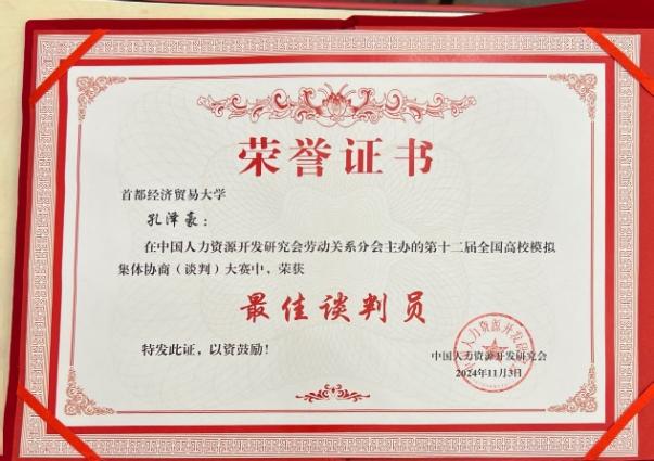 11月1日至4日,由中国人力资源开发研究会劳动关系分会主办,西南政法大学承办的第十二届全国高校模拟集体协商(谈判)大赛成功举办,来自全国29所高校的58支代表队参加大赛。我校17直播 、金融17直播的同学们组队参赛,经过激烈角逐,我校劳方队伍(曾莞晴、王文茜、荆宝竹、龚怀诚)斩获团队二等奖、最佳团队奖,资方队伍(徐瑶玉、莫斯媛、郭映铄、孔泽豪)荣获团队二等奖,王文茜、孔泽豪同学获评优秀谈判员奖,宋湛、郑祁老师获评优秀指导教师奖。