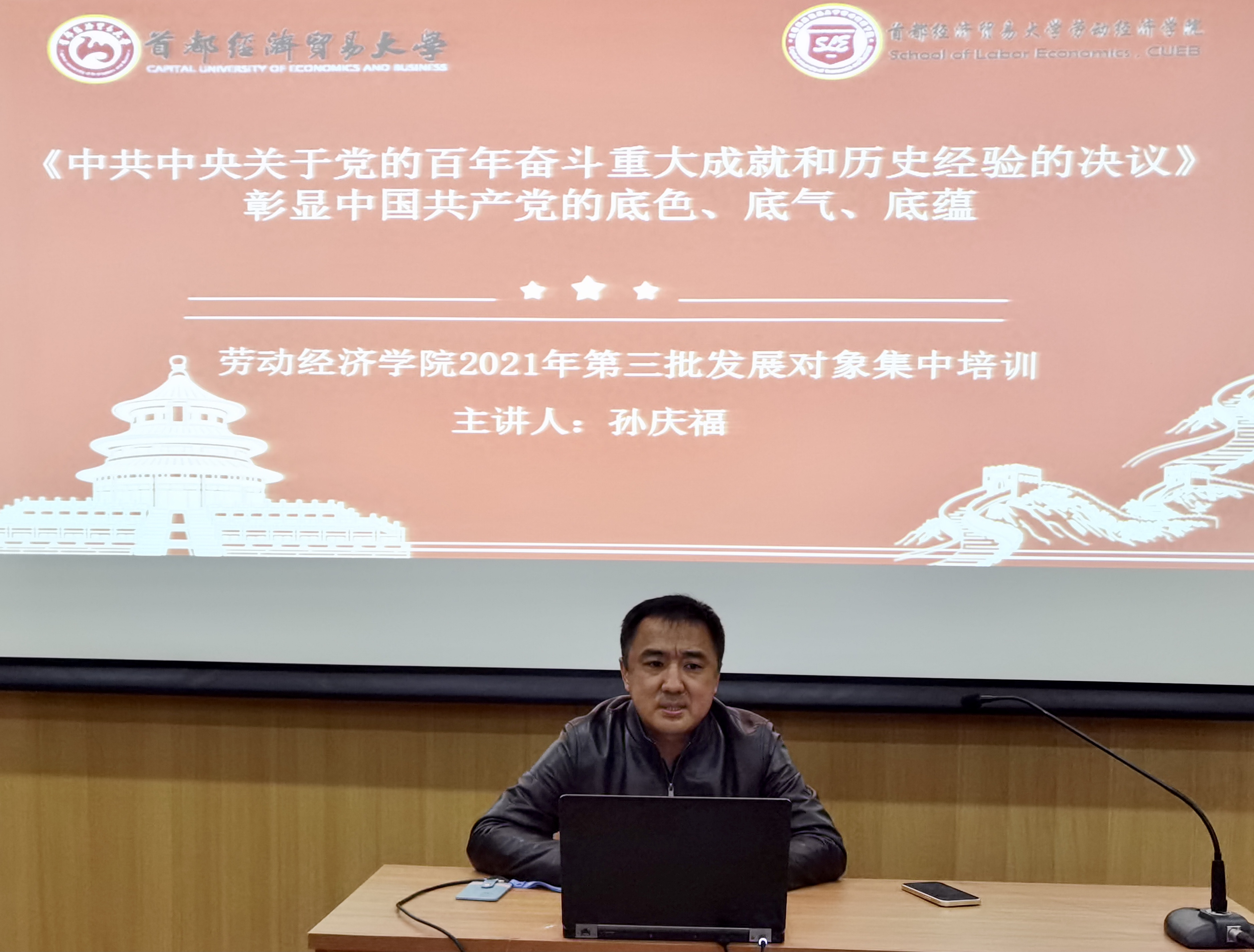 2021年11月15日晚,17直播党委副书记孙庆福应邀为党员发展对象讲授题为“党的十九届六中全会彰显中国共产党的底蕴、底色、底气”的主题讲座,讲座于博远楼1号会议室开讲。