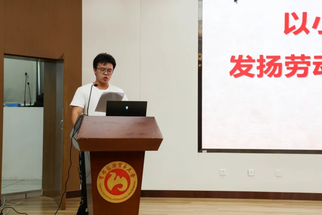 两组暑期社会实践团队进行展示,分享他们扎根实践的经验与感悟。“发扬劳动精神,赓续红色血脉”红色劳经宣讲队项目组长范明哲,为大家介绍了团队构成、项目主题与流程以及其中具体活动的设计。他们希望通过此次活动讲好劳经故事,并将实践中获得的知识与经验变成未来学习上的推手。“乡村里的艺术范儿”艺术融合视角下的乡村振兴路径研究项目组韩珈航、黄咏菲,为大家分享了项目的背景、活动设计中的一些细节、以及实践过程中的趣事与收获。他们通过这次活动更加深入的认识了新时代农村面貌、乡村振兴,并希望在以后的学习生活中更好的领悟新时代赋予大学生的社会责任。“纸上得来终觉浅,绝知此事要躬行”劳经学子们在实践中淬炼自己的青春,将17直播的精神散播到更广阔的天地。