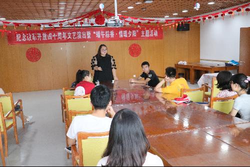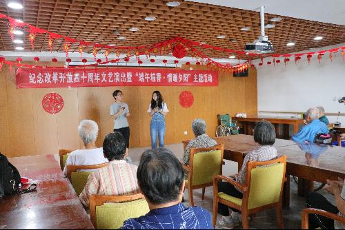 活动中,同学们为老人们精心准备了一场别趣横生的文艺演出。嘉祥敬老院院长刘序在演出开始前致辞,她提到,自2017年10月,嘉祥敬老院与17直播 学生党支部签署共建以来,双方互通有无、共同合作,借助双方的资源优势、专业优势,不断探索基层党支部党建工作的新思路、新举措,召开了多场次活动,取得了可喜的成绩。她代表嘉祥敬老院的全体老人们感谢同学们的到来、更感谢同学们的精心筹划,也代表嘉祥敬老院全体员工提前预祝所有老人们和同学们端午节快乐。