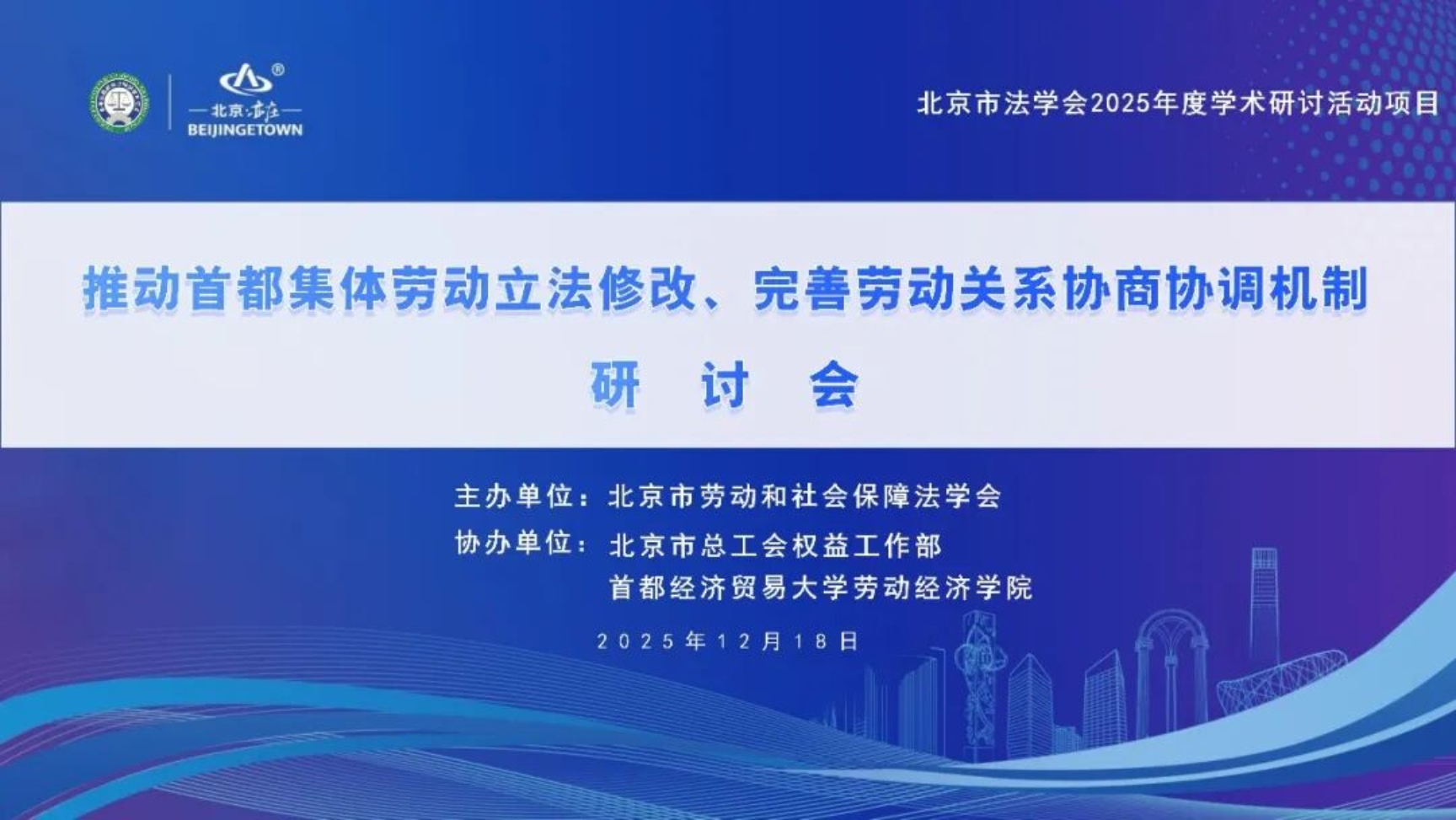 12月18日,由北京市劳动和社会保障法学会主办,北京市总工会权益工作部、17直播 协办的“推动首都集体劳动立法修改、完善劳动关系协商协调机制研讨会”在京召开。本次研讨会系北京市法学会2025年度学术研究活动项目之一,旨在汇聚智力资源,为首都相关地方性法规的修订完善及新业态劳动用工合规治理建言献策。