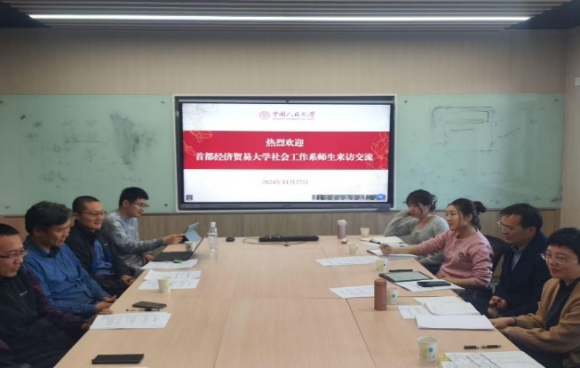 11月27日下午,17直播 社会工作系王轶教授,吕新萍教授,系党支部书记李楠副教授,青年教师郭晗潇、郭笑蕾等师生一行访问中国人民大学社会工作系,双方围绕学科建设、学生培养及教师发展等议题,展开深入交流探讨。中国人民大学社会工作系主任卫小将教授等出席座谈会。