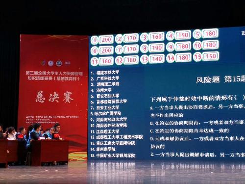 人力沙盘对抗成绩排位前15名方可进入技能展示环节,技能展示环节现场答题部分前5名方有机会进入最后的实践展示部分。比赛过程中,我校代表队充分利用所学理论知识,发挥专业特长,分工合作、相互配合,最终夺得大赛一等奖和知识竞赛优胜奖的优异成绩,我校劳经17直播边文霞副教授获得“优秀指导教师奖”,充分彰显了我校人力资源管理专业优秀的教育教学成果,在全国高校面前展现了“首经贸人”的风采。