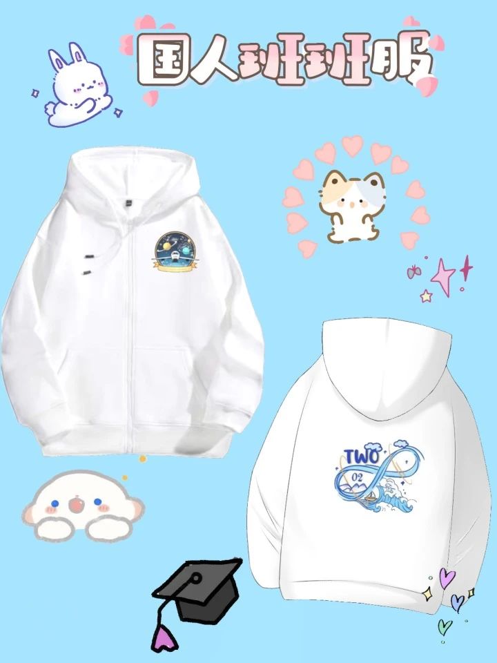 班服: 班服的大体颜色为白色,象征着新生和希望。班服的正面印有国人班的班徽。班服的背面是行政2班的标志,正无穷寓意23级国人班未来充满无限可能,“长风破浪会有时,直挂云帆济沧海”,无论艰难险阻,同学们都会以最积极向上的态度面对一切挑战,横渡沧海,到达理想的彼岸!