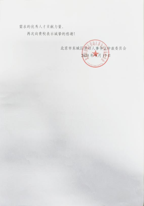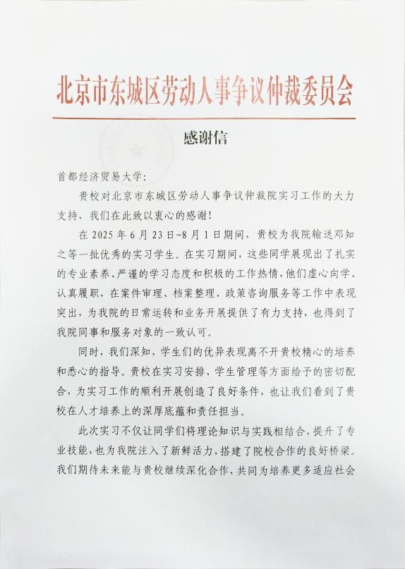 近日,17直播 收到北京市东城区劳动人事争议仲裁委员会发来的感谢信,信中对我院卢雨凝、卢雨薇、贡佳晖、陈昊燃、叶林杰、努热艾拉・莫拉、邓之知、艾丽菲热・吐尔干、李嘉莹等9名同学暑期实习期间的优异表现给予高度评价,同时对双方首次合作的圆满落地表示认可,为后续深化联动奠定基础。