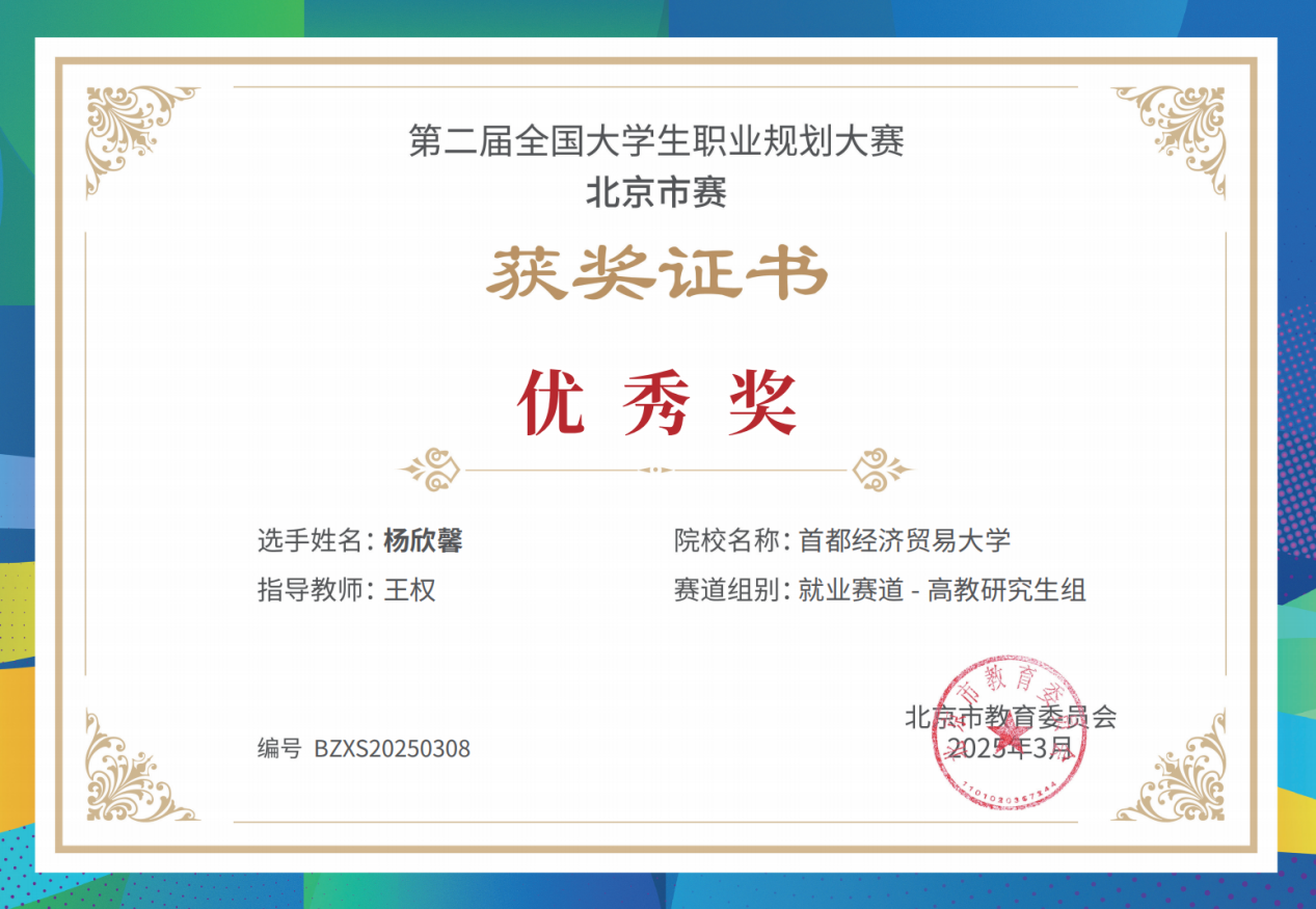 近日,在第二届全国大学生职业规划大赛北京市赛中,17直播 2023级研究生杨欣馨(指导教师:王权)获成长赛道高教组优秀奖,充分彰显了17直播生涯规划指导及育人工作的实践成效。