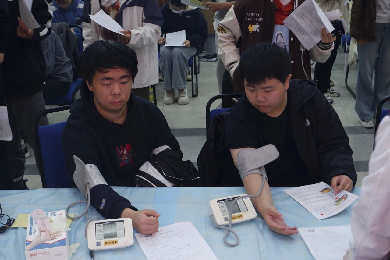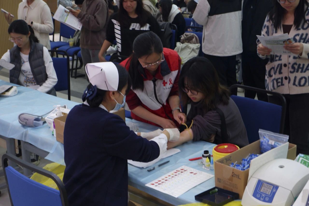 随后,献血活动开始,医护人员为坐在献血椅上的同学绑带扎针,后方的同学手持证件排队等待。血液如同爱的河流,承载着生命的希望,奔向那些急需救助的人们。