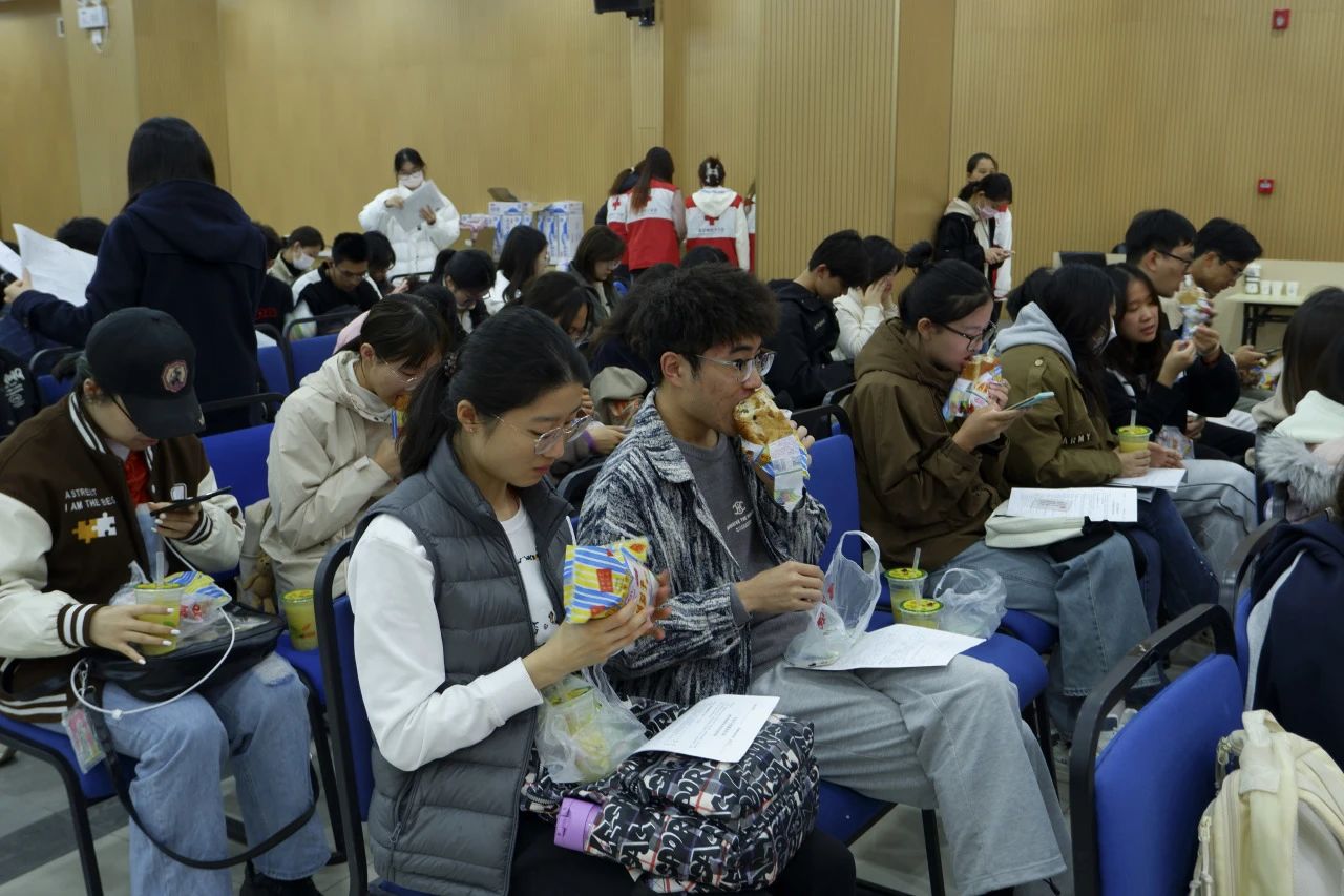 为提供良好的献血环境,10月31日早8时,志愿服务部的志愿者们提前来到现场组织签到,引导献血的同学入座休息并统一分发爱心早餐。