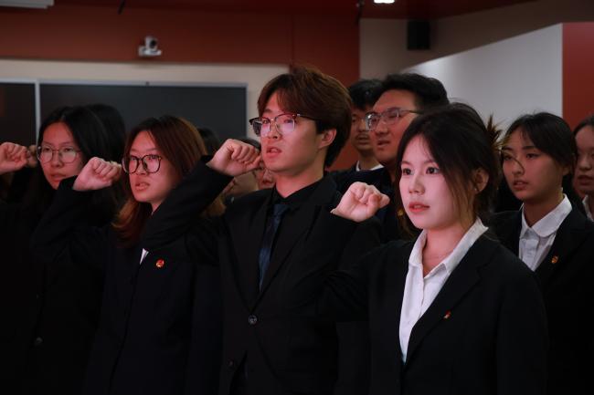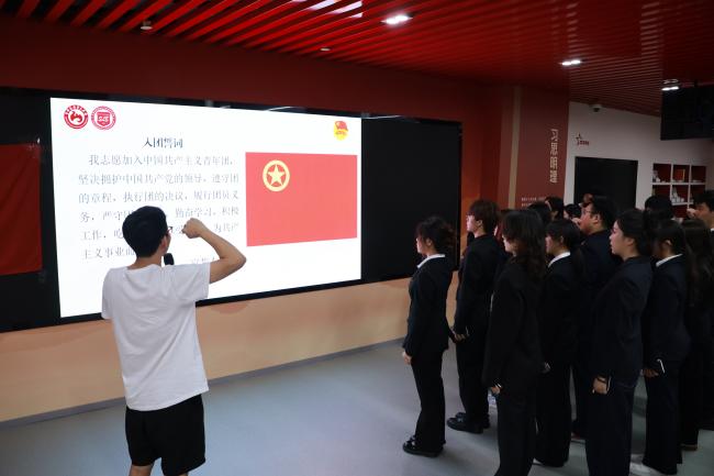邓钰澄带领新团员宣誓。入团誓词是一份铿锵有力的誓言,也是对共青团组织的庄严承诺。新团员举起右拳在团旗下郑重宣誓,将团员青年应践行的使命与担当牢记于心。