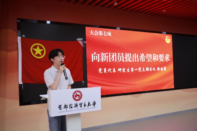 党员代表、研究生第一党支部韩国晟向新团员提出希望和要求。他指出,新团员应在加入共青团后以更加严格的标准要求自己,在学习、生活、工作等方面发挥模范作用,坚定理想信念,厚植思想根基,将个人理想融入国家发展,在中国式现代化建设的新征程上挺膺担当。