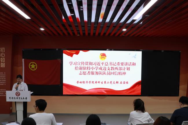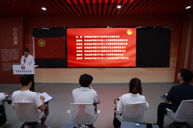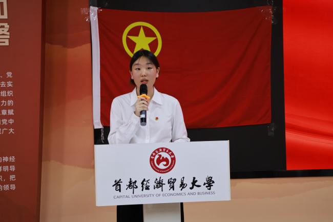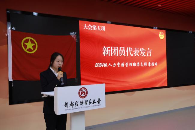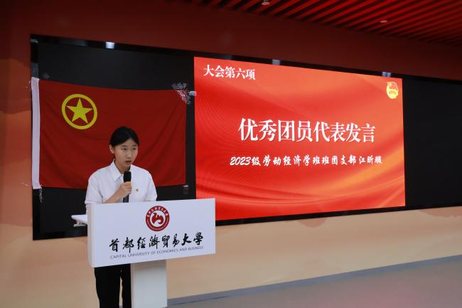 优秀团员代表、2023级劳动经济学班团支部江昕璇发言。她结合自身经历分享了自己的成长感悟,并阐明共青团员的责任与使命。同时,她结合共青团的光辉历史与伟大成就,号召新团员们踔厉奋发、勇毅前行,与国家同呼吸、共命运。