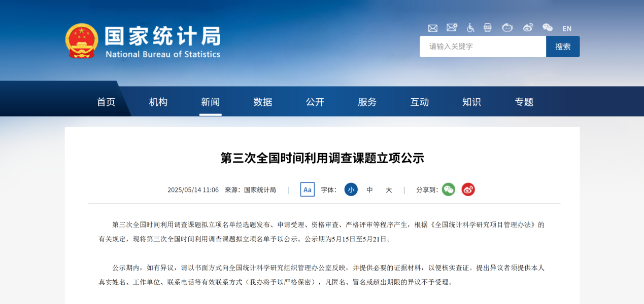 第三次全国时间利用调查由国家统计局组织开展,旨在全面、真实、准确了解我国居民时间利用情况,客观反映居民生活质量和生活模式的变化,为改善民生福祉、科学制定社会民生政策提供翔实、准确的统计信息支撑。