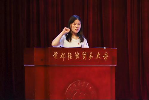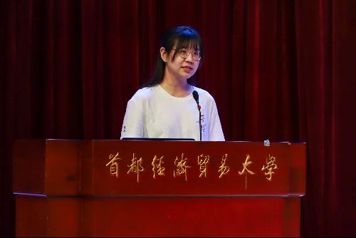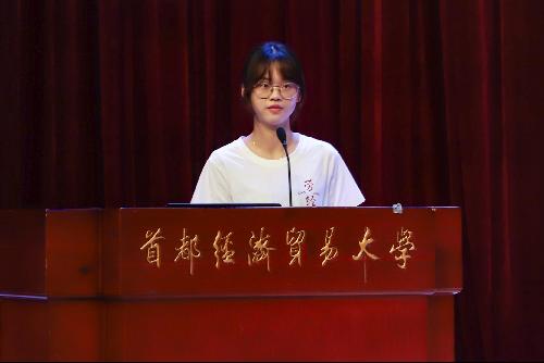 2021级刘泽菲作为新生代表上台发言。经过十二年的不懈奋斗,终得首经贸的相遇,与劳经17直播的并肩而行,感悟崇德尚能和经世济民的情怀。她希望自己以及所有新生在未来的四年里,树立目标、学海游弋,博观约取、扎根实践,不断明晰劳经人所肩负的责任与使命,共圆一个家国有我的青春中国梦。