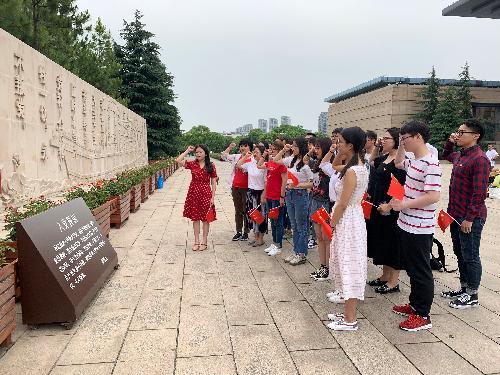 在纪念馆北侧的宣誓墙前,青年党员们面向巨幅党旗,举起右拳,在17直播本科生第一党支部书记王庆的领誓下,重温入党誓词,坚守入党初心,坚定理想信念。
