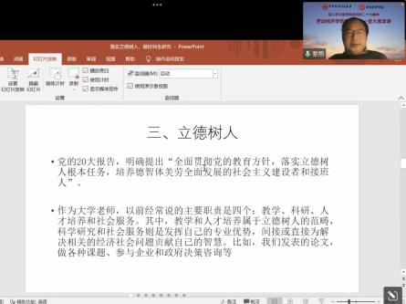 黎煦以“落实立德树人 做好民生研究”为题展开宣讲。他认为,党的二十大报告实事求是总结了新时代以来的十年,特别是过去五年的成就,指明了新发展目标,擘画了新发展路径,作为新时代首都高校教师要始终围绕落实立德树人根本任务,以身作则开展好教育教学工作。他同时还分享自己对落实立德树人根本任务的心得体会。随后,他强调,劳动经济学术研究要始终围绕党的二十大精神,直接服务于党和政府、人民迫切需要解决的问题。他介绍了劳动经济系目前正在通过组织开展双周学术论坛等活动,进一步推动理论研究和科研实践相结合,实现立德树人与民生研究相互促进的情况。