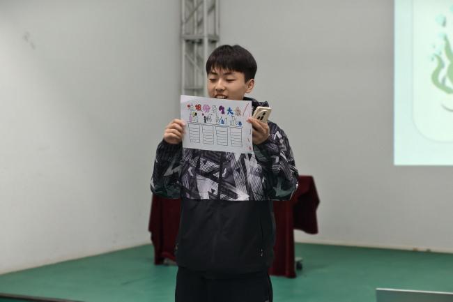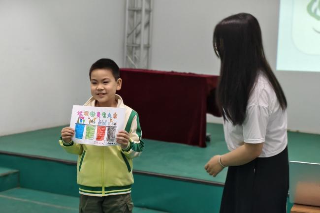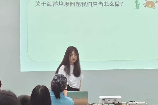 2024级劳动与社会保障班王文惠为小朋友们带来关于海洋垃圾的科普分享。当前海洋垃圾成为污染海洋生态环境的“元凶”,不仅直接威胁海洋生物的生存,更会通过食物链引发毒素富集,使整个海洋生态系统面临不可逆的破坏。为了让小朋友们为海洋垃圾分类贡献出自己的一份力量,王文惠带领大家进行了“垃圾分类连连看”的互动游戏,通过动手匹配垃圾图标与对应处理方式,加深小朋友们对海洋垃圾分类标准的记忆与实践。