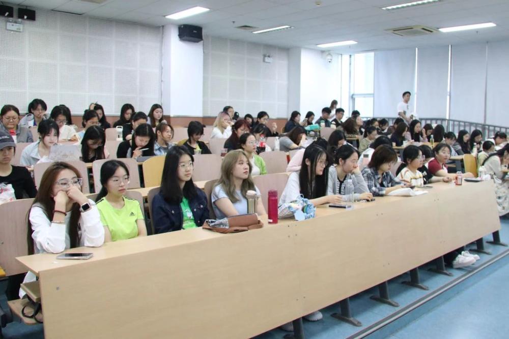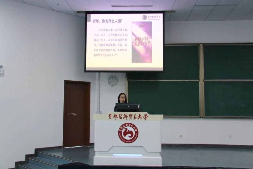 在入党教育中,郭英以“为什么要入党”为切入点,教育同学们要端正入党动机,提高政治觉悟、思想觉悟,并推荐了红剧《觉醒年代》,图书《马克思靠谱》《顶天立地谈信仰》,鼓励同学们在书里了解马克思,理解共产主义信仰,寻找自己关于信仰的答案。郭英简要回顾了党的百年奋斗史,诞生于民族危难之中的中国共产党,不忘初心、牢记使命,带领中国人民完成了新民主主义革命、社会主义革命,开辟了中国特色社会主义道路,创造了人类社会发展史上惊天动地的发展奇迹。到本世纪中叶时,在座的同学们正处于年富力强的人生鼎盛时期,期望大家珍惜这样的历史际遇,不负时代、不负韶华,立强国报国志,做奋斗经贸人,奋力书写为中国式现代化挺膺担当的青春篇章。接下来,郭英详细解读了申请入党、推荐优秀团员作入党积极分子、推荐优秀团员作党的发展对象、成为预备党员及预备党员转正的全部流程。
