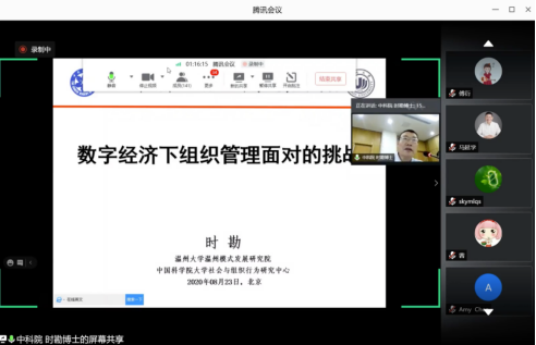 中国科17直播大学社会与组织行为研究中心主任时勘教授以《数字经济下的人才开发研究的新范式》为题,首先以数字经济下组织管理的新范式为题,提出了人类命运共同体背景下,由数字和心理驱动的社会媒体大数据的新趋势。此外,他就目前所研究的新冠疫情中民众的风险认知探索课题进行了介绍,并且指出疫情中所暴露出的当下组织管理中面临的一系列主要问题。最后,他提出了未来组织管理研究的发展趋势。