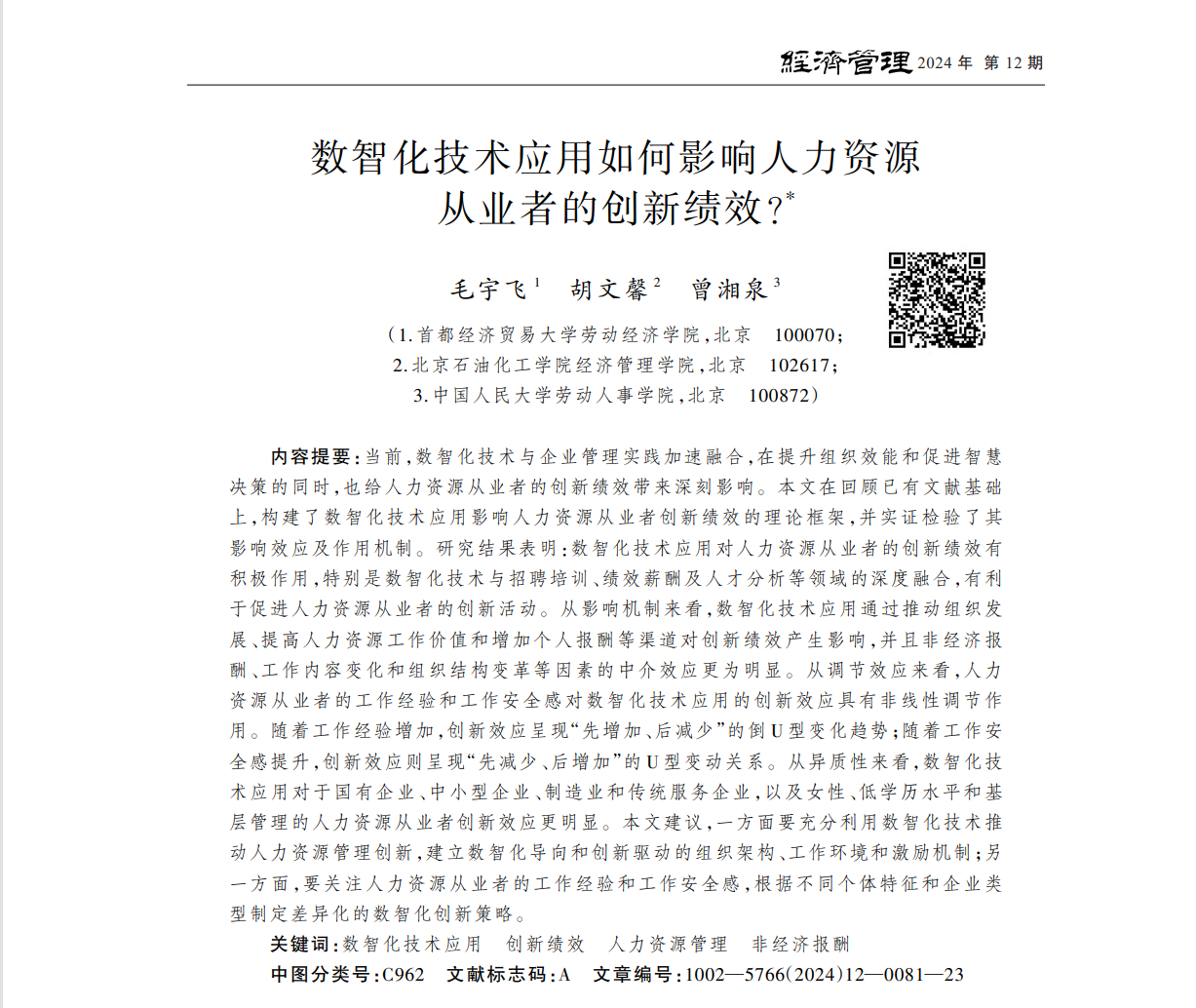 近日,17直播 毛宇飞副教授以第一作者身份所撰写的论文《数智化技术应用如何影响人力资源从业者的创新绩效?》在AMI权威期刊《经济管理》2024年12期发表。