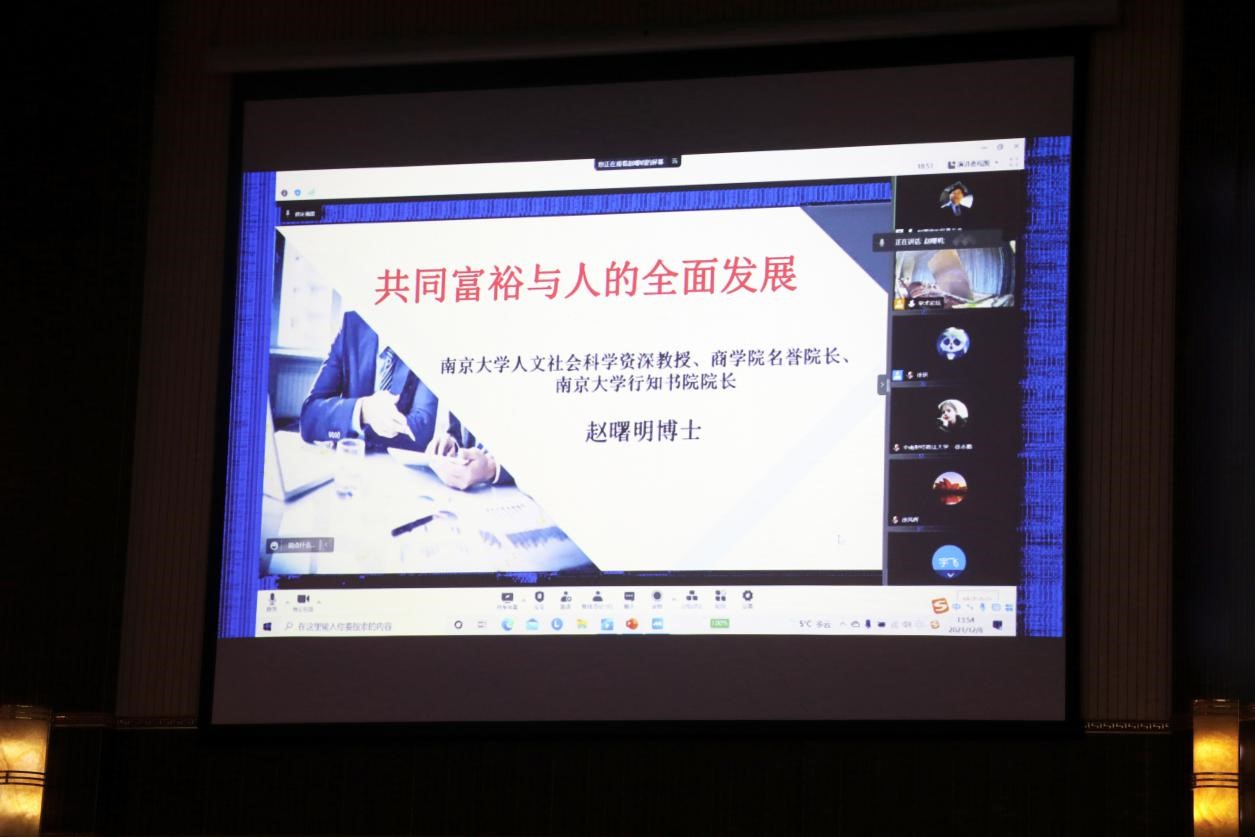 论坛以线上线下相结合的方式进行。南京大学人文社科资深教授、商17直播名誉校长、行知书院院长、博士生导师赵曙明应邀为同学们做关于“共同富裕与人的全面发展”的主题演讲,赵老师从共同富裕的背景、共同富裕的必要性、共同富裕与人的全面发展和共同富裕与社会生态四个方面具体展开了论述,最后得出了人的全面发展和组织生态助力于共同富裕的重要结论。