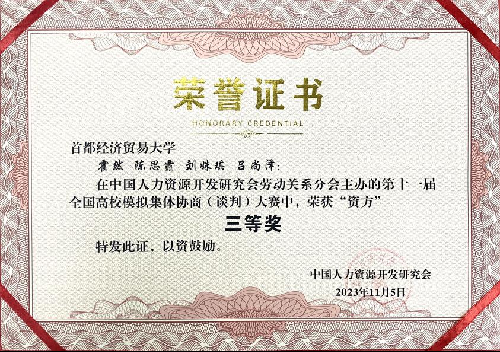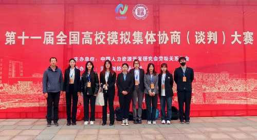 经过激烈角逐,我校劳方队伍(潘瑾、徐向前、常润林、徐雨珊)斩获团队一等奖、最佳团队奖,资方队伍(吕尚泽、霍然、刘姝琪、陈思霏)荣获团队三等奖,潘瑾、刘姝琪、常润林同学获评优秀谈判员奖,盛龙飞老师获评优秀指导教师一等奖。