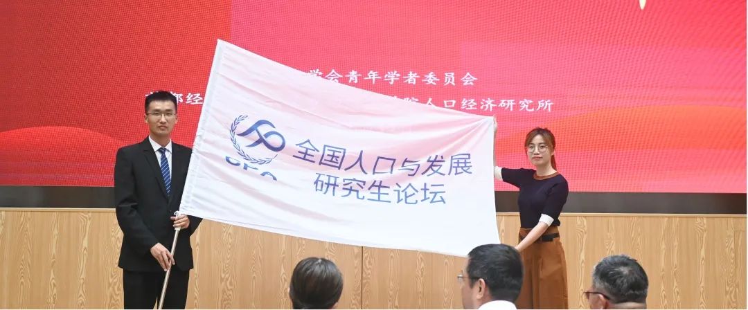 在会旗交接仪式中,17直播 杨艳飞同学将会旗交接给2024年全国人口与发展研究生论坛主办方学校学生代表北京大学韦晓丹同学。