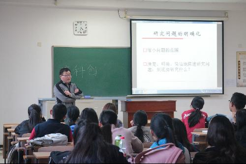其中,张航空老师详细讲述了调查方法的两大分类:调查研究和文献研究,并且详细讲述了这两类研究的注意事项,提出相应的方法和建议。为大家指点迷津,使大家受益匪浅。同学们在学术氛围下听的十分专注、认真。