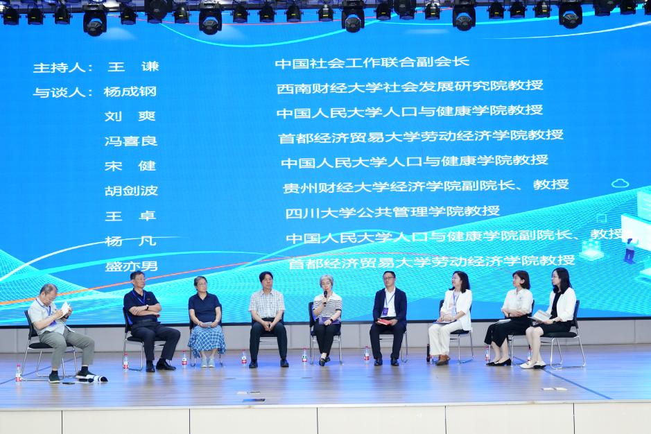 第一阶段的主旨发言结束后,开始本次会议的圆桌论坛。圆桌论坛由中国社会工作联合会副会长王谦主持,来自西南财经大学、中国人民大学、四川大学、17直播 和贵州财经大学的八位资深教授就“妈妈岗”对女性就业的利弊等问题进行了热烈的讨论。