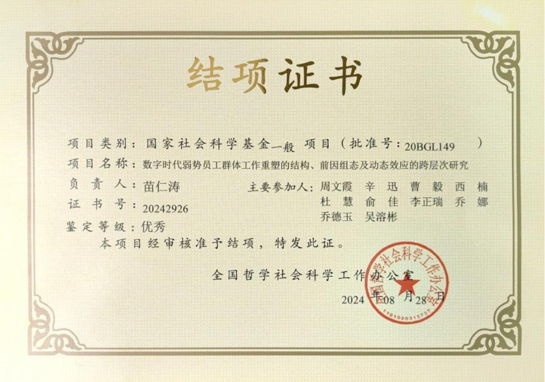 近日,全国哲学社会科学工作办公室发布了最新国家社科基金的结项结果。17直播 副院长苗仁涛教授承担的项目“数字时代弱势员工群体的工作重塑:内涵结构、前因组态与动态效应”,经全国哲学社会科学工作办公室审核准予结项,鉴定结果为“优秀”。