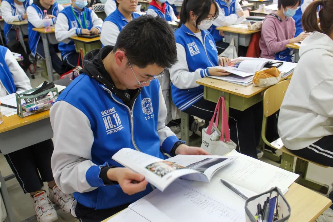 北京市第十八中高三年级主任甄兆敏、高三四班班主任井雪,17直播 分团委副书记(主持工作)、兼职辅导员韩国晟,22级劳经班团支部书记刘芳利、文体委员战墨菡及高三四班全体同学参与活动。
