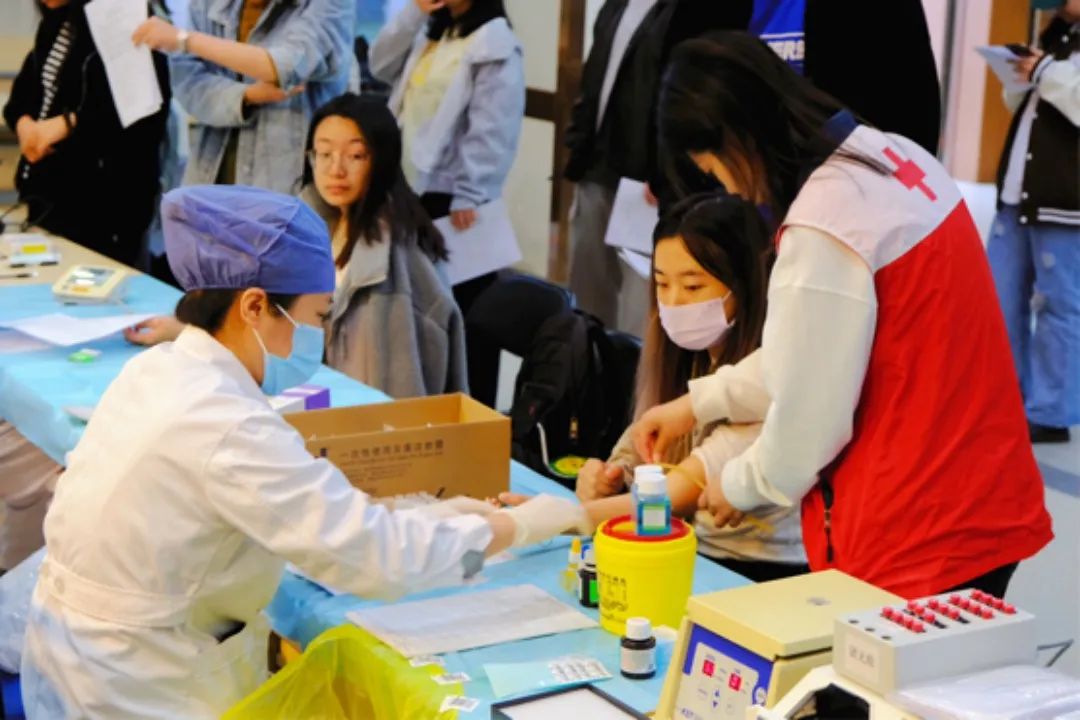 随后,同学们手持献血登记表和身份证,按部就班地参与献血工作。在志愿者的引导下,大家有序排队进行登记体检。经过测量血压、抽血化验、检测转氨酶指数和血型指标等一系列严格的体检流程,同学们带着一丝紧张与期待,开始进行献血工作。卷起衣袖,伸出手臂,绑好压脉带,他们始终目光坚定,一个接一个地完成这场生命力的传递。在这期间,志愿者们贴心的问候和及时递上的红糖水也让这次的献血活动变得温暖愉快。
