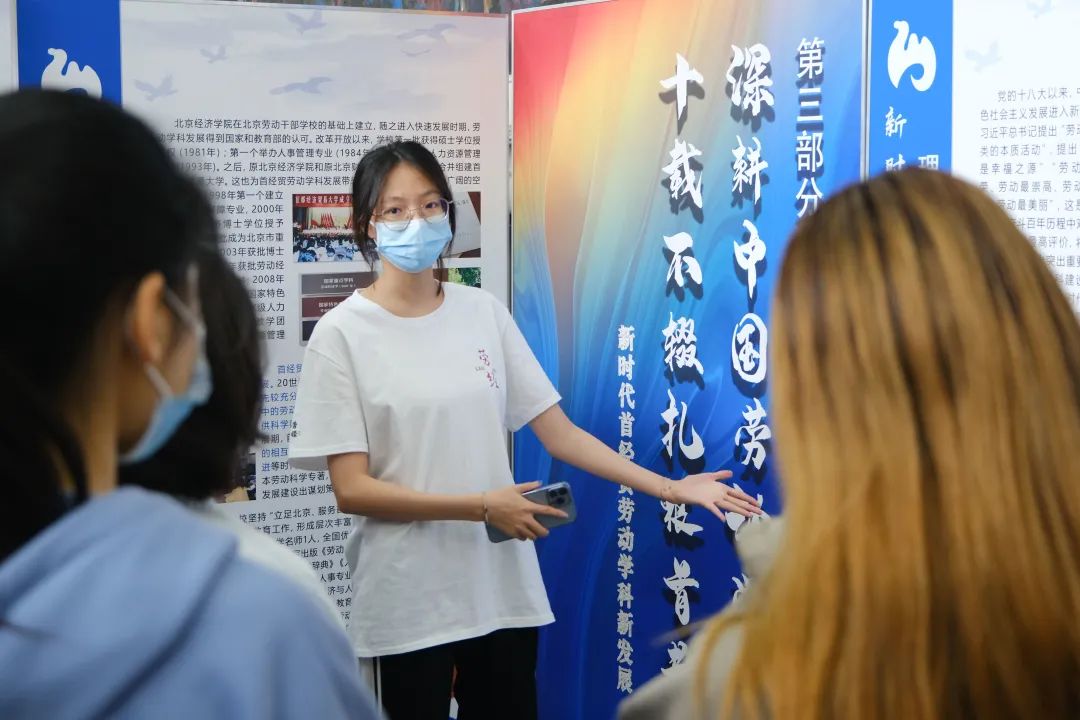 最后,由王佳艾为大家讲解展览的第三篇章——“深耕中国劳动学科 十载不辍扎根首都”,主要为大家介绍了新时代首经贸在劳动科学研究方面取得的新成就、新发展。王佳艾为同学们介绍了劳经17直播人才培养体系和学科建设体系的由来和根据以及17直播对培养同学们的劳动实践能力的重视。